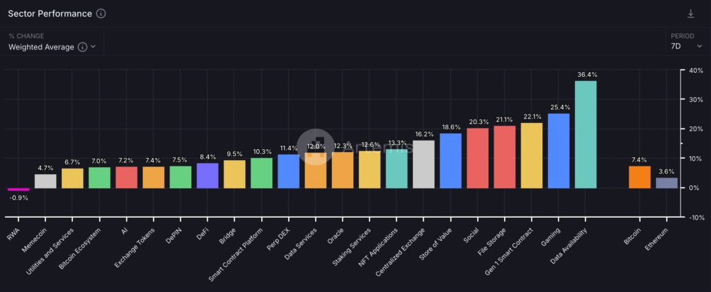 - 平均漲幅最大達 36.4% 的是 Data Availability(Celestia、Dymension,不過該分類代幣較少)