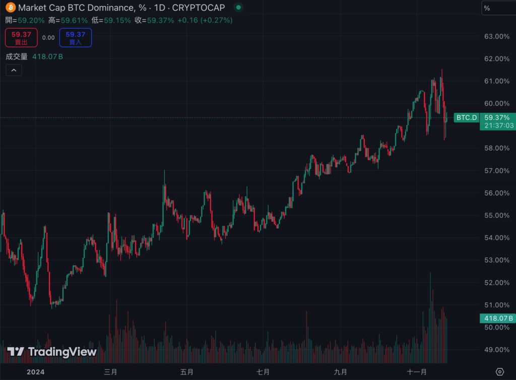 雖然目前比特幣昨晚有所回調,但上述強勢幣種的走勢仍然算堅挺,到底要如何判斷山寨季是否到來?還是只是主力在收割空頭?我們或許可以觀察 BTC.D(比特幣市佔率)的變化。