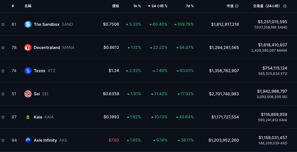 下圖是近 24 小時百大代幣的漲幅表現,可以看到 SAND(過去兩天拉漲超 100%) 和 MANA 這兩個老牌元宇宙概念幣近日漲幅驚人。
