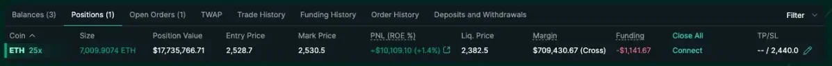 當前持倉情況:他現在正以 25 倍槓桿做多 ETH。