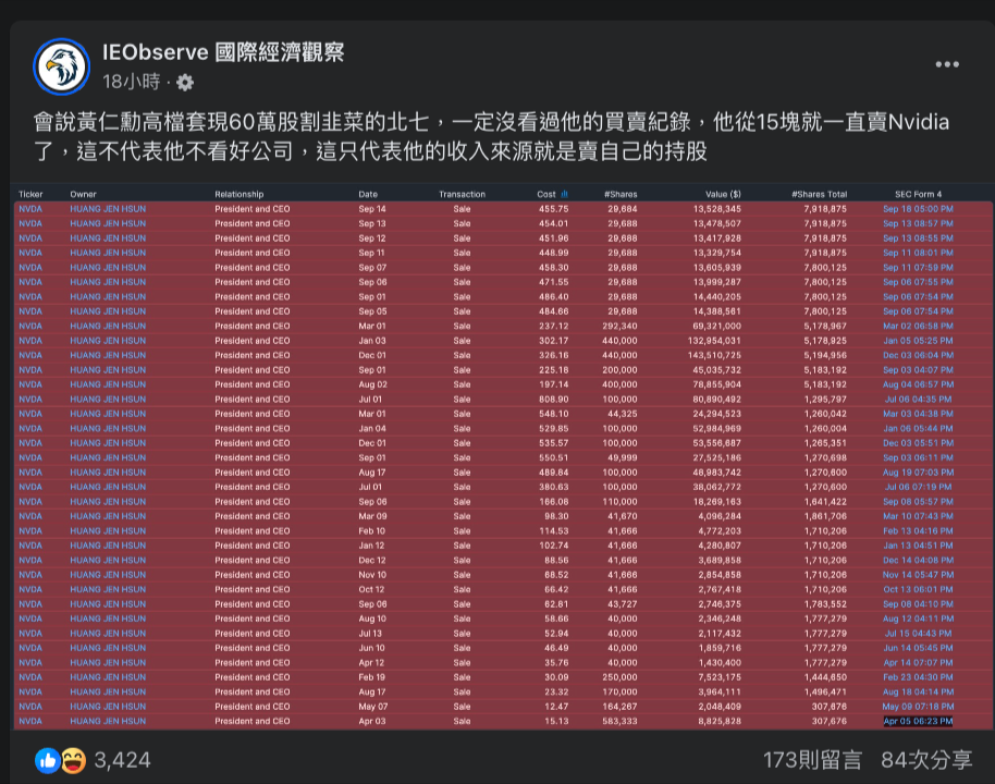 會說黃仁勳高檔套現 60 萬股割韭菜的北七,一定沒看過他的買賣紀錄,他從 15 塊就一直賣 Nvidia 了,這不代表他不看好公司,這只代表他的收入來源就是賣自己的持股。