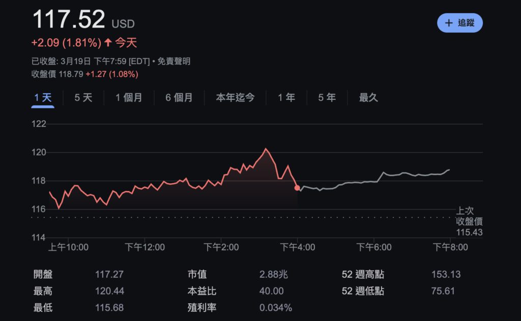 輝達股價雖然在近 1 個月時間仍下跌了 15%,但在聯準會最新利率會議帶來略微寬鬆的好消息後,輝達今晨盤中一度上漲超 3%,收盤報 117.52 美元,單日上漲 1.81%。
