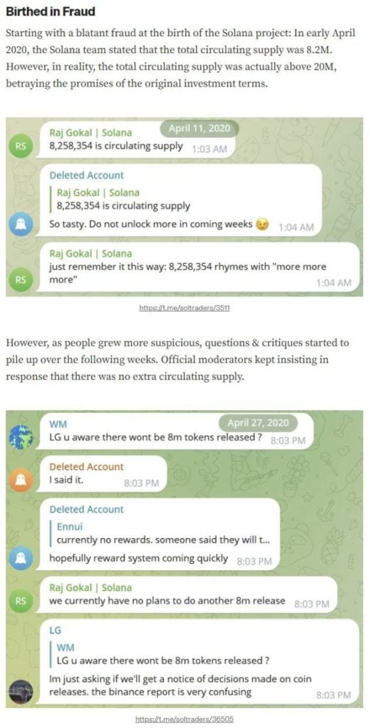 然而,醜陋的事實是,2020 年,Solana 團隊確實在流通供應量上撒了謊。即便這些數量對如今的市場已無關緊要,但它無疑仍是 Solana 歷史中的一個污點。為了完全透明,我在之前的批評中對此有詳細闡述,我甚至還附上了證據: