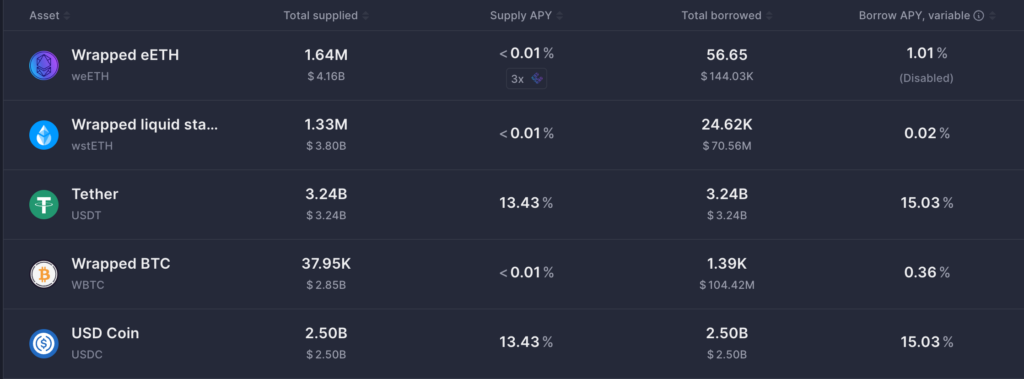 據借貸協議龍頭 Aave 數據,USDT 借款 APY 目前已暴漲至 15.03%、存款 APY 則來到 13.43%(USDC 也是同樣的狀況)
