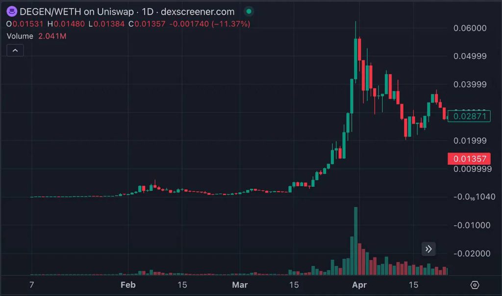 然而,一個有趣的用例和短暫的熱潮並不一定意味著一個好的投資。在我們討論的兩個例子(DEGEN 和 DMT)中,原生代幣都經歷了顯著的波動,這些鏈還遠未被證明。