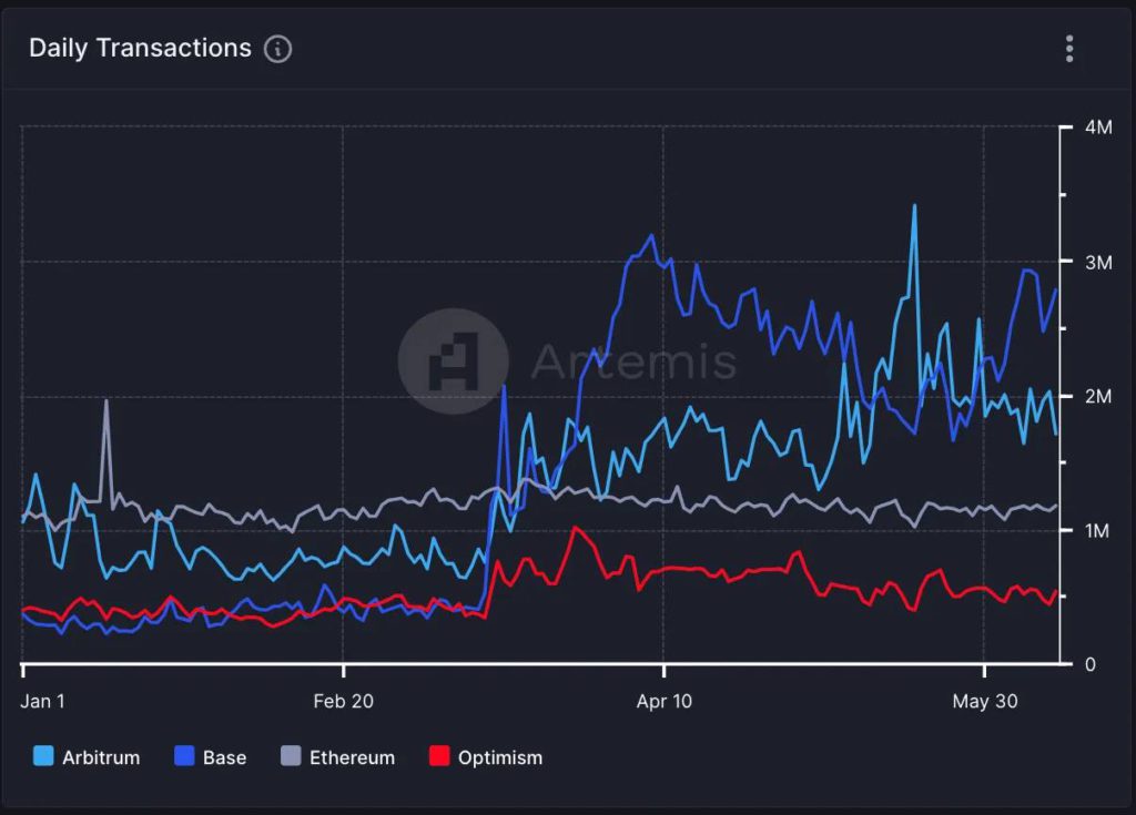 自從 Dencun 升級以來,Arbitrum 和 Base 的日交易量已經超過了以太坊主網,並且這一趨勢持續未變。雖然以太坊的擴展套件仍有很多工作要做,但這是朝著正確方向邁出的重要一步,基礎設施自上一個週期以來顯著改善。最近幾個月,Arbitrum 和 Base 鏈上的活動和交易量增加,可能只是本週期將要到來的冰山一角。