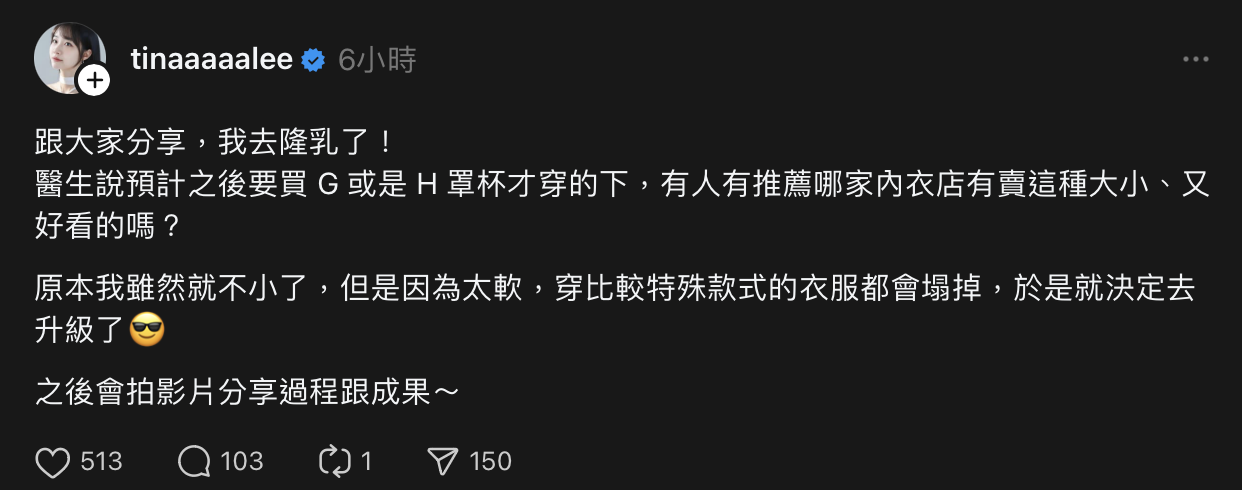 李婷婷宣布「我獨自升級成G杯」求社群推薦內衣,Web3+AI尺碼再擴大