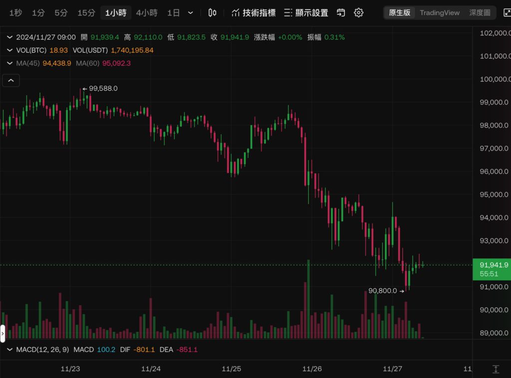 不過從上週末起,比特幣開始出現川普當選後最明顯的回調,自 99,000 美元附近一路震盪下跌,今晨最低來到 90,800 美元。撰稿當下略有回升,現報 91,941 美元,近 24 小時跌幅縮窄至 2.3%。