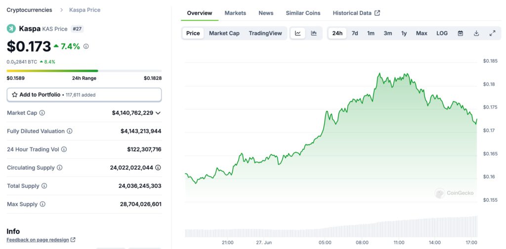 目前 KAS 價格有所回落,現報 0.173 美元,市值達 41.4 億美元,是第五大 PoW 礦幣,且是市值排行榜第 27 大幣種。