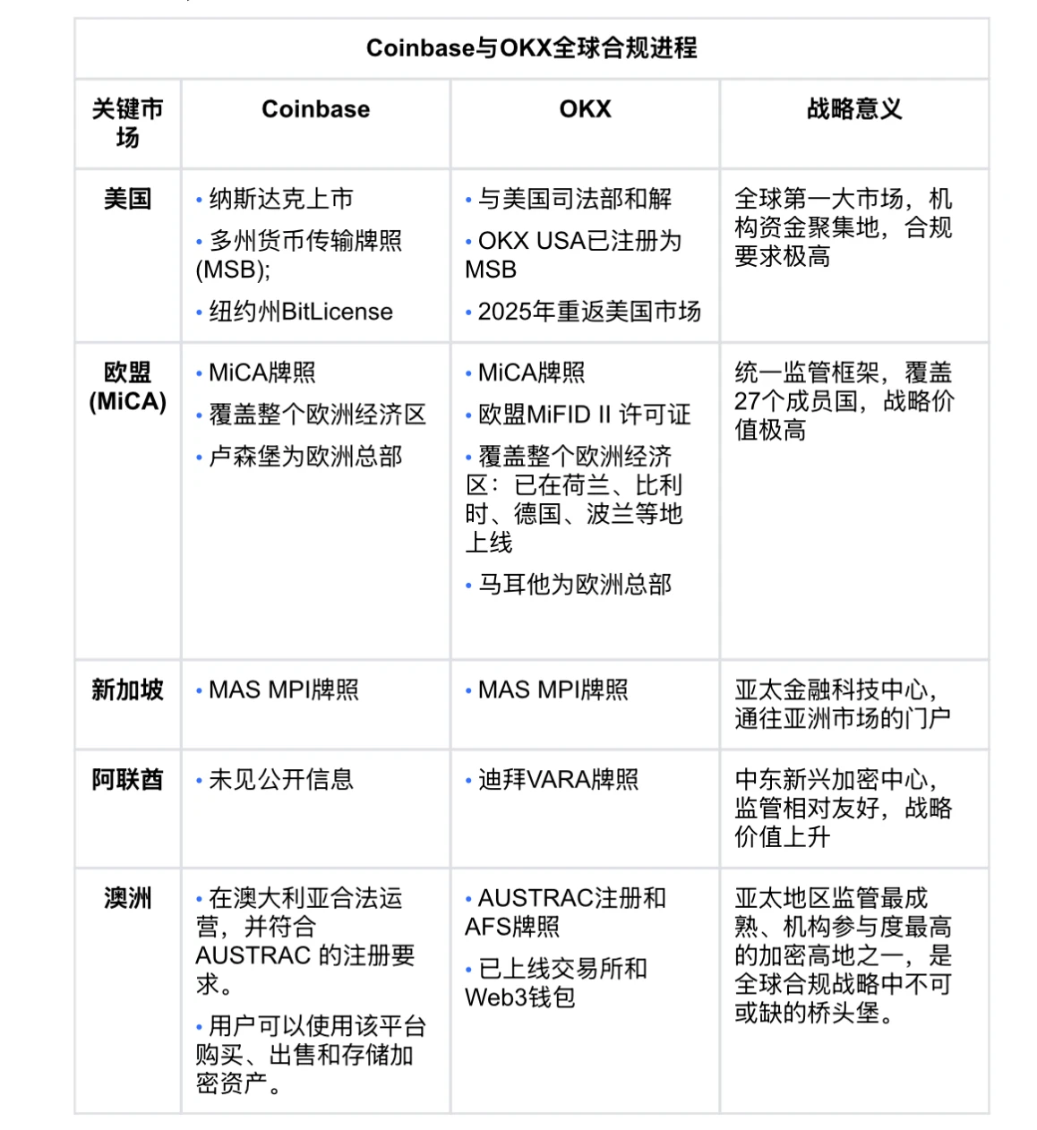 在全球牌照佈局上,OKX 持了有歐盟 MiCA 牌照、新加坡 MPI 牌照等高品質許可,並在美國進行 MSB 註冊與合規重建,且業務不斷向發達市場集中,甚至可與 Coinbase 媲美。此外,兩家交易所在均已在全球多個重要地區獲取關鍵牌照,差距逐漸縮小。