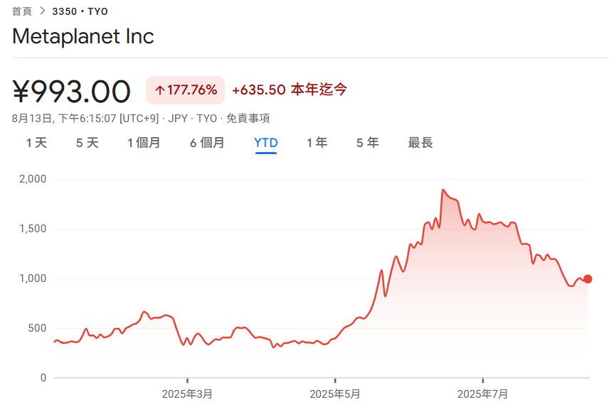 自建立比特幣儲備以來,Metaplanet 的股價得到了大幅激勵。據谷歌財經數據顯示,今年至今,Metaplanet 股價再度大漲了 177%,8 月 13 日收盤價報 975 日圓,市值來到了 6,880 億日圓。
