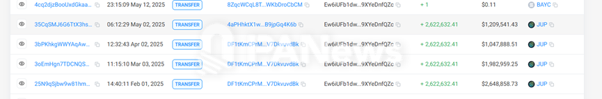 而領取數量排名第二和第三的地址則看起來具有極強的關聯性。從簡單的行為上來看,這兩個地址都是 JUP 的大戶,經常活躍在 Jupiter 流動池的添加當中。但巧合的是,這兩個地址的 JUP 轉賬數量多次保持統一,都是 2,622,632.41 這個數量,且活動時間也常常是同一天。
