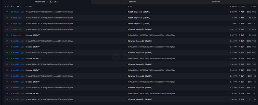 過去 8 個月,通過該地址拋售的 JUP 代幣數量超過 3000 萬枚。