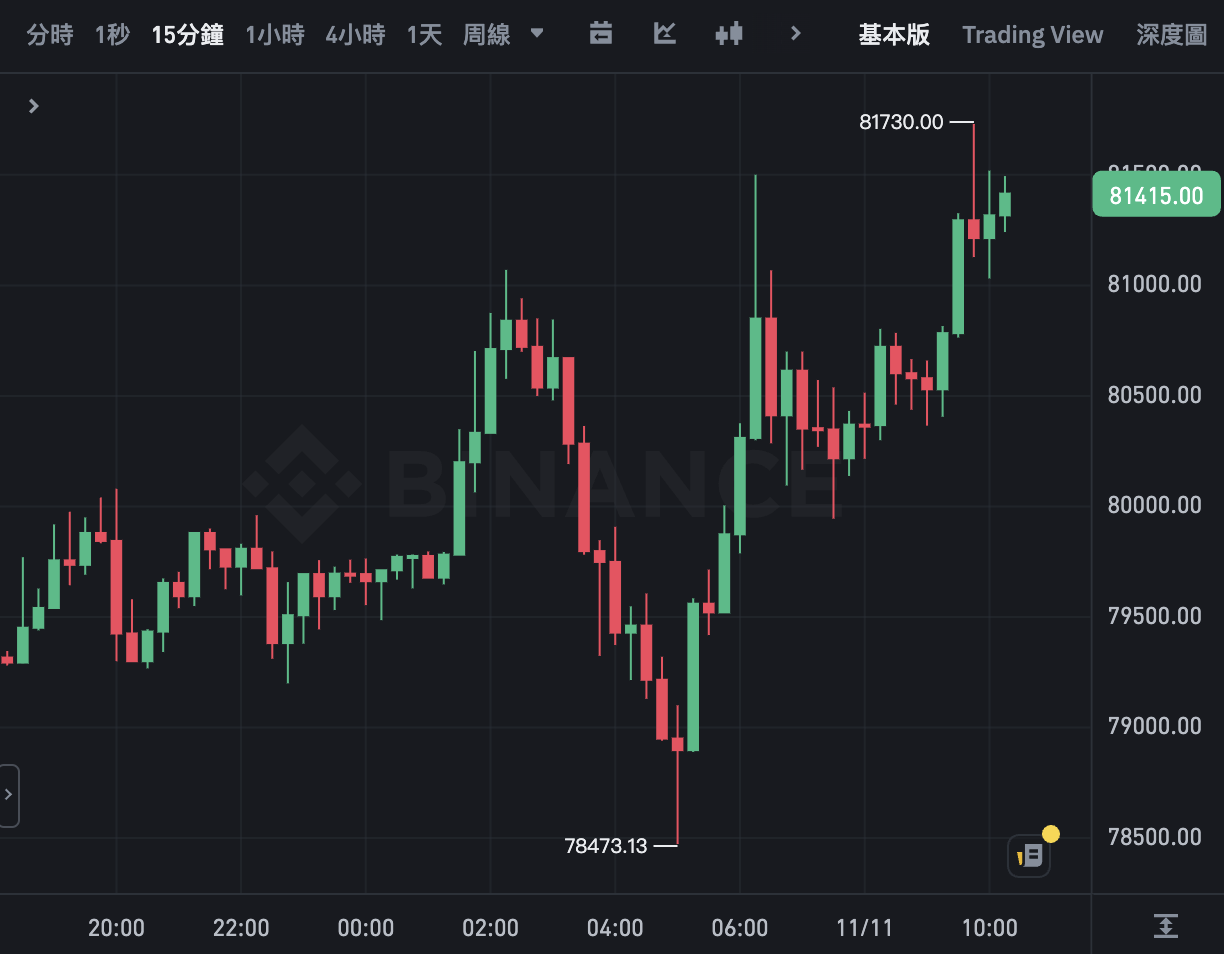 自川普當選後,比特幣連日來持續大漲,昨日更是一小時內上漲 2,000 美元,一舉突破 7.9 萬美元大關。今日凌晨繼續上衝,約 1 點半時突破 8 萬美元,震盪上漲下於早上 10 點再創下 81,730 美元的歷史新高。
