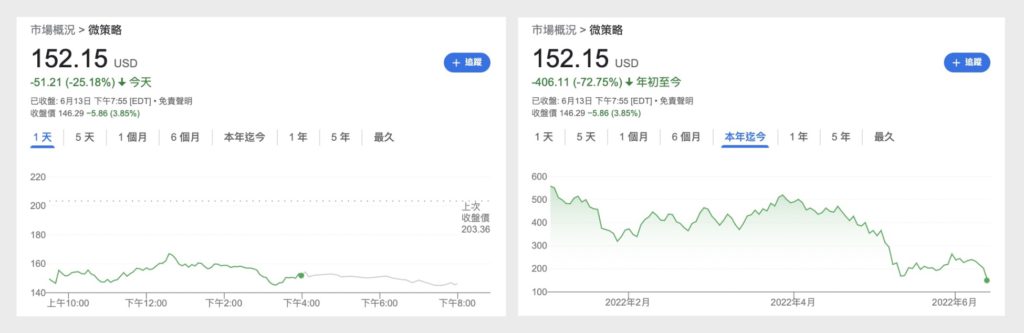 美國擁有最多比特幣的上市公司微策略(MicroStrategy),目前擁有 129,218 枚比特幣,平均購買成本爲 30,700 美元,以 BTC 目前報價 21,162 美元計算,帳面損失已達 12 億美元,浮虧 31%;該司股價受此拖累, 13 日開盤後暴跌 25% 收在 152.15 美元,今年迄今已大失血 72.75%。