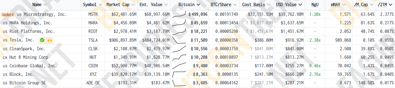 在近期比特幣的持續下跌中,作為美國上市公司中的比特幣持倉量霸主 Strategy(微策略,原名 MicroStrategy)。據 bitcointreasuries 最新數據顯示,微策略當前持有的比特幣總量為 499,096 枚,總購買成本約為 331.51 億美元,持倉總價值縮水到 397.55 億美元,未實現盈利下降到僅剩 66 億美元。