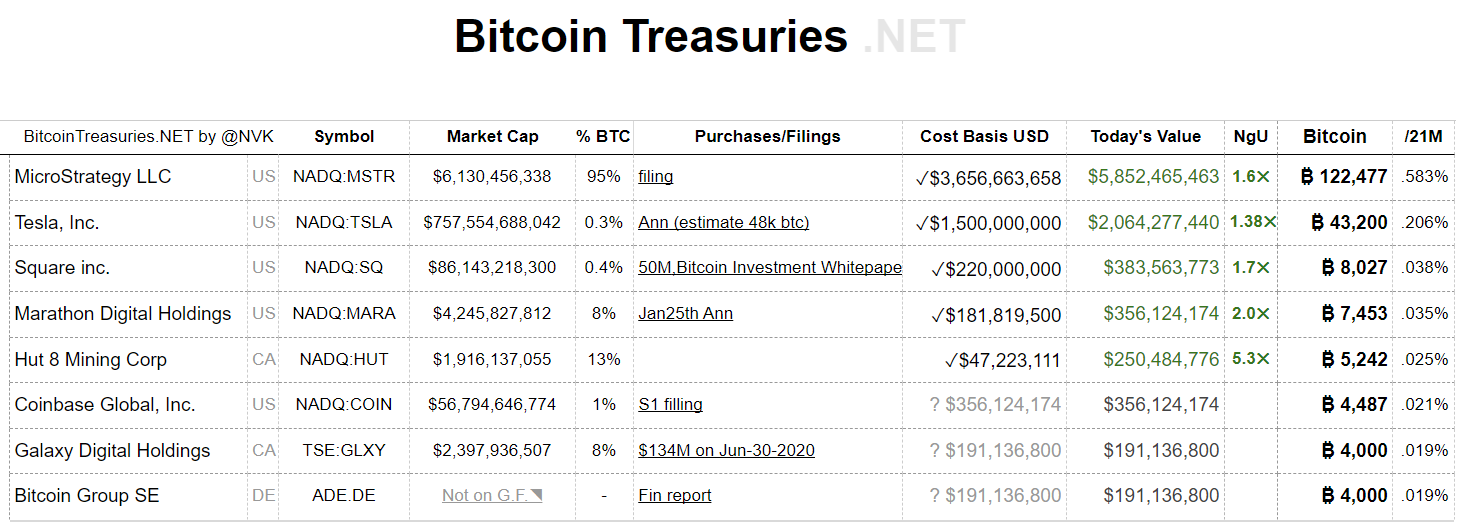 監測上市公司比特幣持倉量的 Bitcointreasuries.net 數據則顯示,微策略持續穩居上市公司 BTC 持幣霸主,BTC 佔該公司市值為驚人的 95%,遙遙領先後方的 Tesla、Square(Block)、Marathon Digital Holdings、Coinbase Global 等。