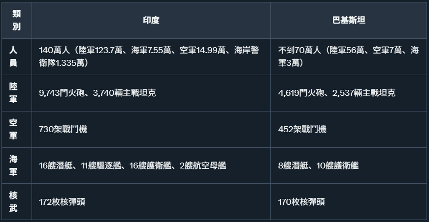 綜上來看,印度在常規軍事力量上具壓倒性優勢。其軍事人員數量幾乎是巴基斯坦的兩倍,陸軍火砲和主戰坦克數量分別高出約一倍和 50%,空軍戰鬥機數量領先約 60%。