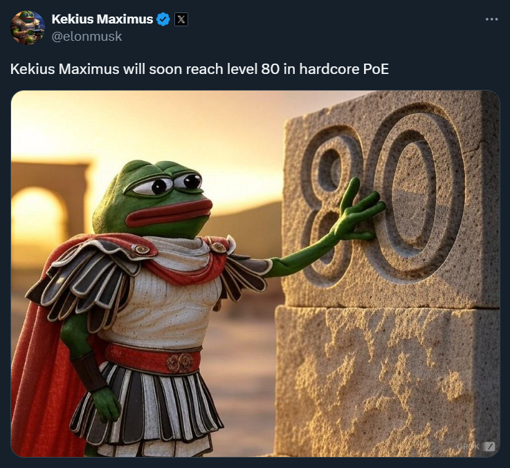 「Kekius Maximus」並非首次登場——去年底 Musk 就曾用此暱稱轉發 X 用戶 Gamer 創作的一張帶有 PEPE 形象的圖片,且同時將自己的社交頭像也修改為一個佩佩蛙,並發文表示:「Kekius Maximus 即將在 Path of Exile 高難度模式中達到 80 級。」