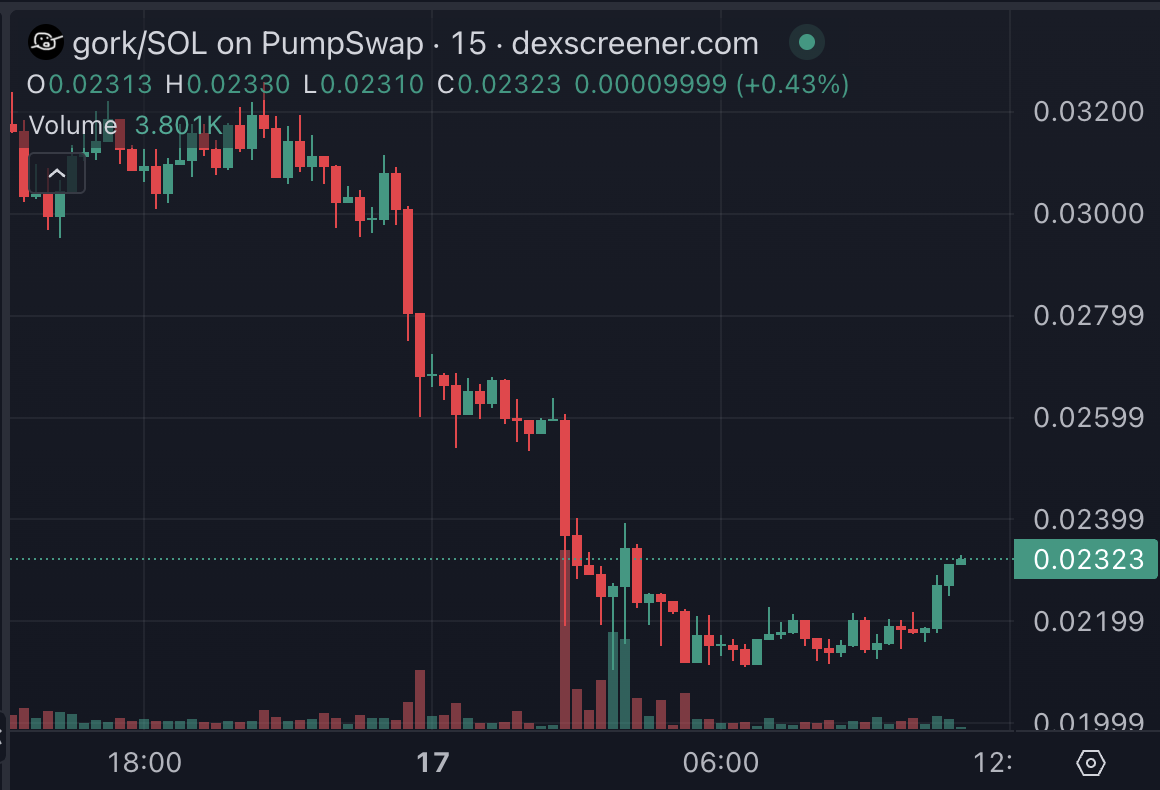 反觀,之前受到追捧的迷因幣 $gork 則一度下探至 0.02116 美元,近 24 小時下跌 26.46%,資金快速轉向新寵。