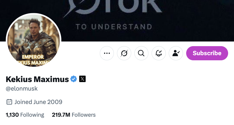 今日凌晨, Musk 先將暱稱恢復為「Elon Musk」,隨後又改成「Kekius Maximus」,頭像同步換成相關 MEME 圖。這激勵 Kekius Maximus 同名迷因幣飆漲。