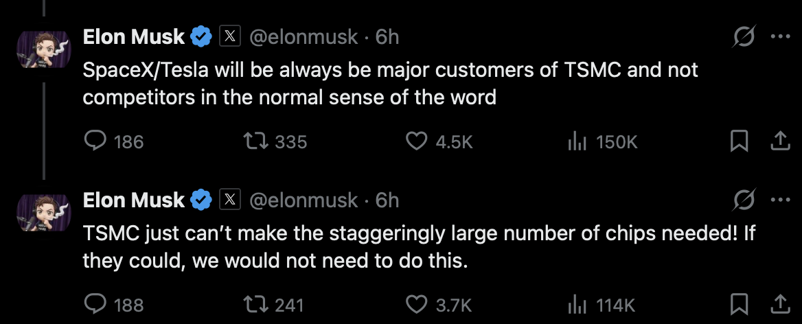 SpaceX/Tesla 永遠會是 TSMC 的主要客戶,而不是一般意義上的競爭對手。