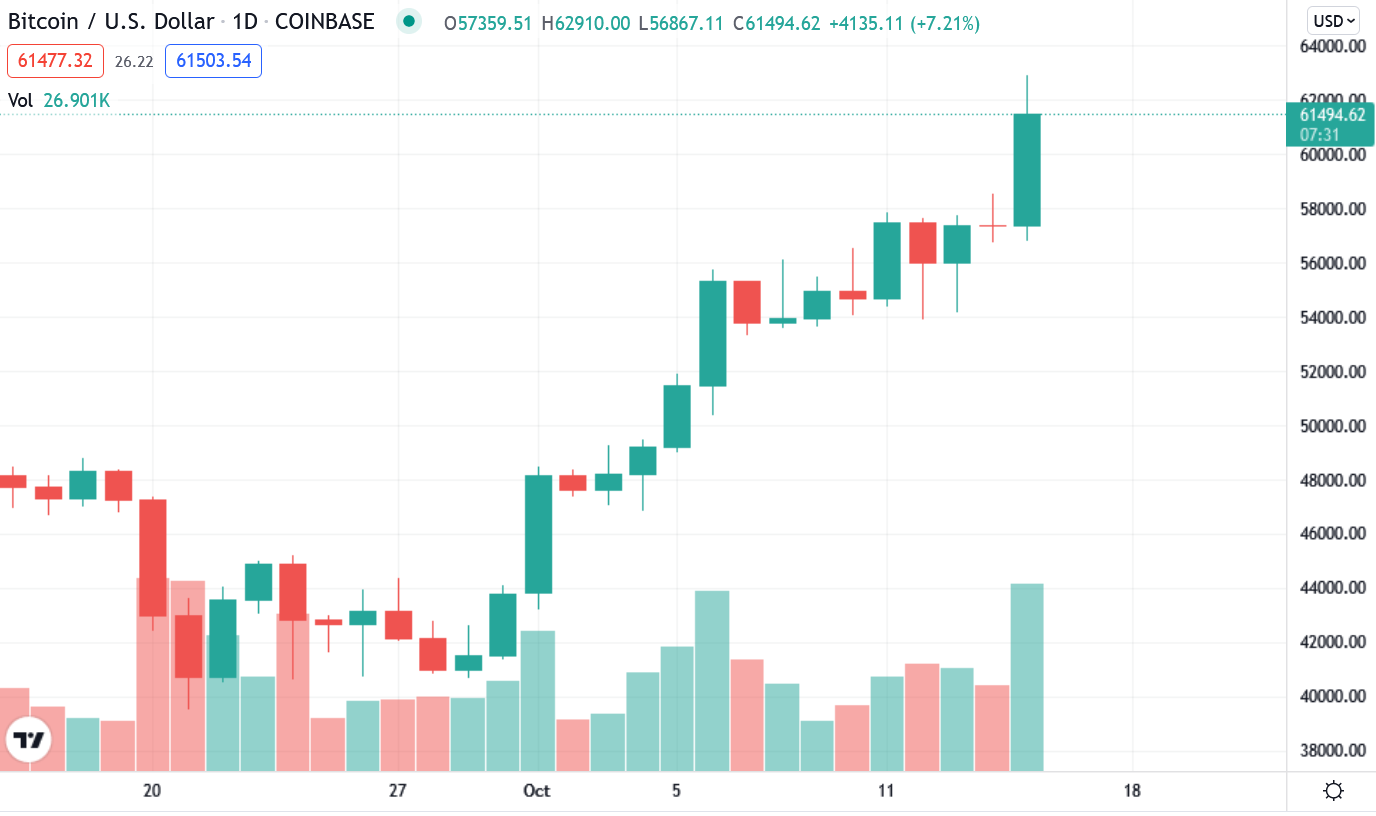 比特幣 ETF(指數股票型基金, Exchange Traded Funds)準備上市的消息頻傳,帶動連日來比特幣的強勁漲幅!隨著真正的第一槍 ProShares 據傳 10 月 15 日已獲 SEC 文件批准、登上彭博終端機(Bloomberg Terminal)後,市場牛市情緒來到最高點;當日(15日)稍早,美國那斯達克(Nasdaq)也宣布了已同意列出 Valkyrie ETF 進行上市準備、就等 SEC 點頭。