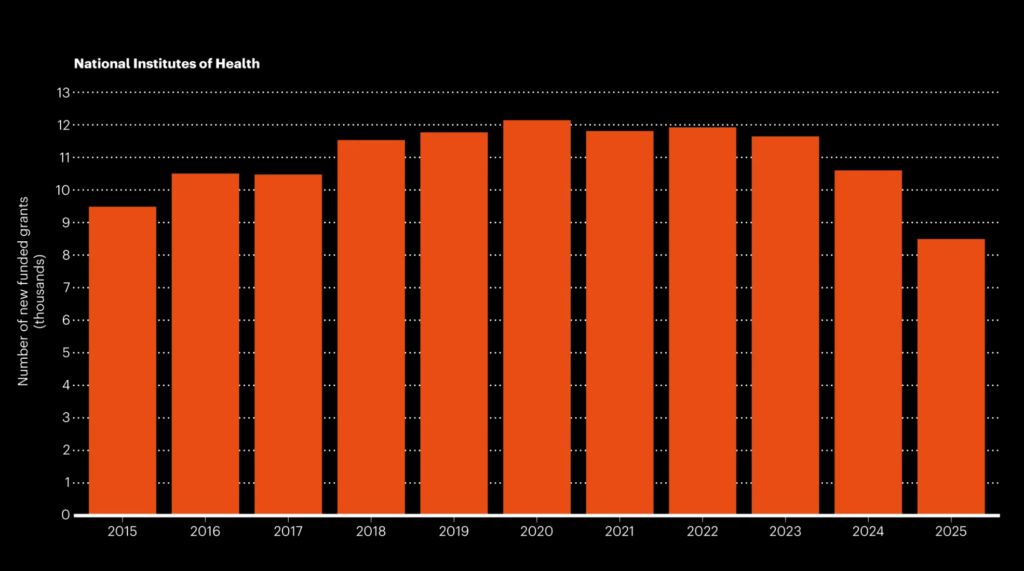 • 新計畫減少: 2025 年 NSF 與 NIH 發放的新資助項目分別減少了 25% 與 24%。