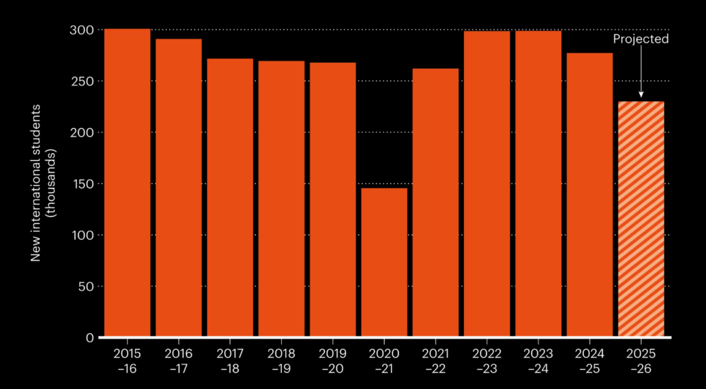 • 留學生銳減: 2025–26 學年,美國大學的新生留學生人數下降了 17%,除 2020 年疫情期間外,為十年來最低點。