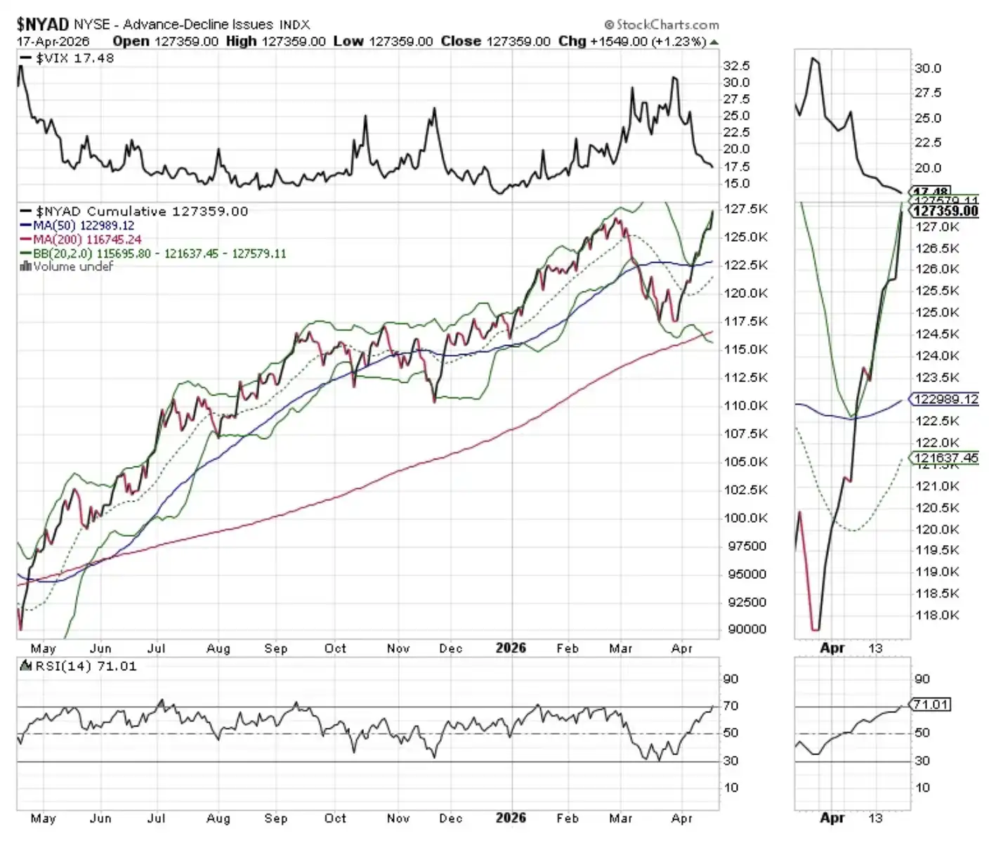 NYSE Advance-Decline Line(紐交所漲跌線)創出新高,與 S&P 500 Index 和 NASDAQ-100 Index 同步刷新高點,形成確認訊號。