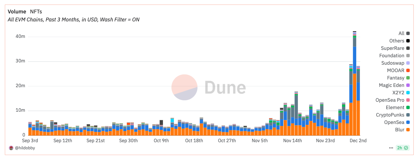 RTFKT 在 NFT 市場黎明前夕關閉,令社群深感遺憾。據加密貨幣風投 Dragonfly 數據總監 @hildobby 製作的 Dune 圖表顯示,近 3 日 NFT 市場的交易量顯著飆升。