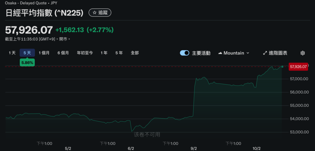 在選舉行情帶動下,日經 225 指數今日開盤即跳空高開,報 56,812.01 點,隨後持續攀升。截至台北時間上午 9 時 25 分,日經指數上漲 1,541.94 點、漲幅達 2.74%,報 57,905.91 點,一舉突破 56,000 和 57,000 兩大整數關口,續創歷史新高紀錄。