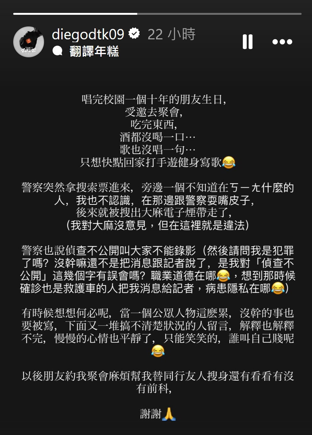 陳零九自己則在 IG 發限時動態澄清,當天他是受邀去參加一個朋友聚會,酒都沒喝一口、歌也沒唱一句,只想要快點回家打手遊、健身、寫歌,沒想到警察突然拿搜索票進來: