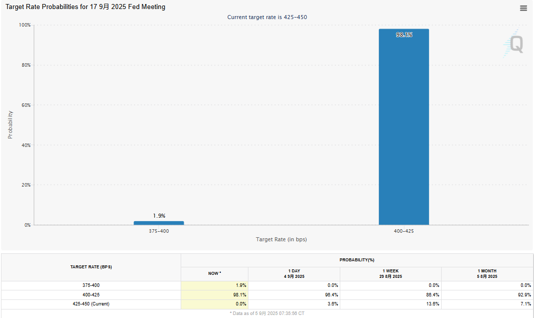 最新的非農就業數據無疑印證了勞動市場表現疲軟的事實。報告發佈後,市場預計聯準會在本月中的 FOMC 會議上重啟降息、並降息一碼的機率升至 98.1%,幾乎可說是板上釘釘,甚至在 9 月一次降息兩碼的機率,也從 0 冒出到了 1.9%。