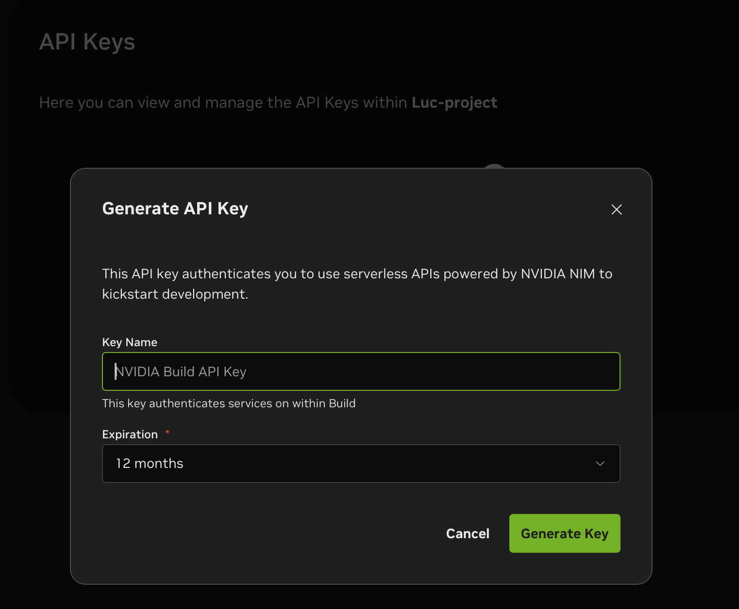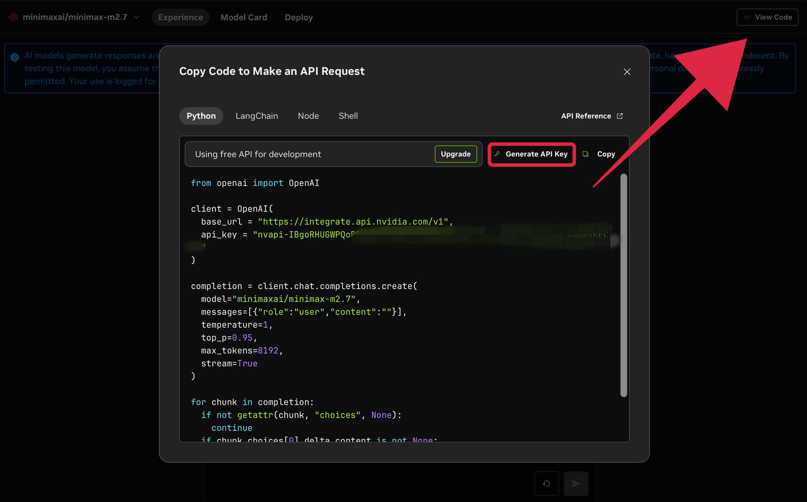 回到 build.nvidia.com/models,挑一個想用的模型點進去,按右上「View Code」會顯示對應的 Model ID,點「Generate API」,多出來那行 key 直接複製到你的程式裡就可以了。