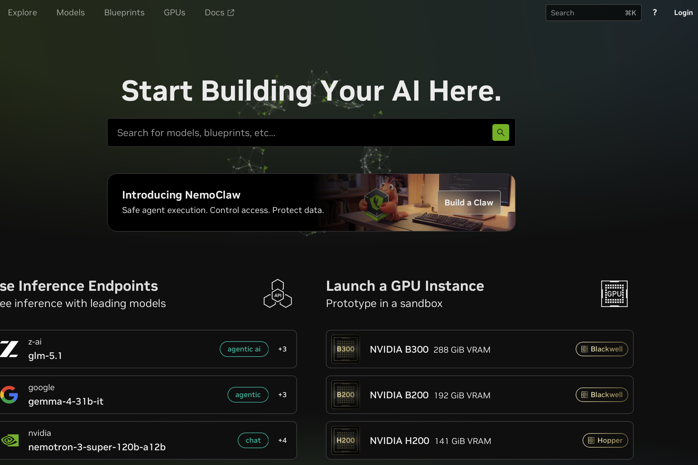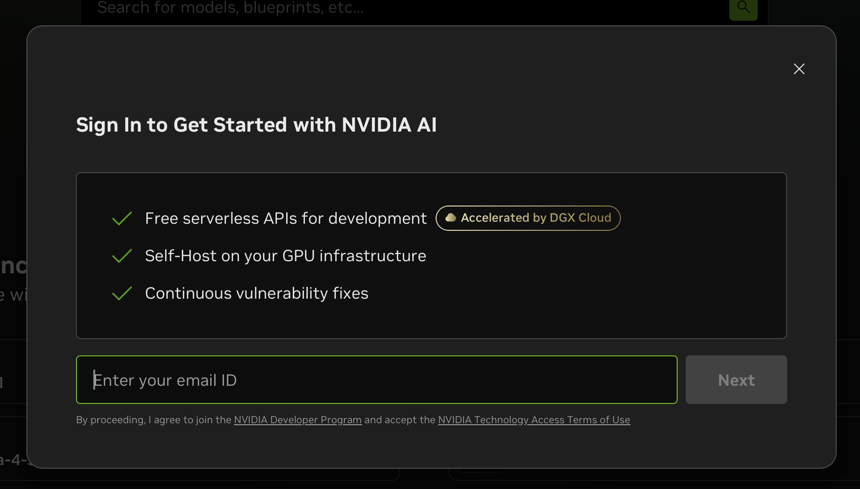 NVIDIA 在 build.nvidia.com 上跑了一個平台,叫 NIM(NVIDIA Inference Microservices,輝達推論微服務),背後架在 DGX Cloud 上,API 格式跟 OpenAI 相容。註冊就能免費用,超過 100 個模型任選。