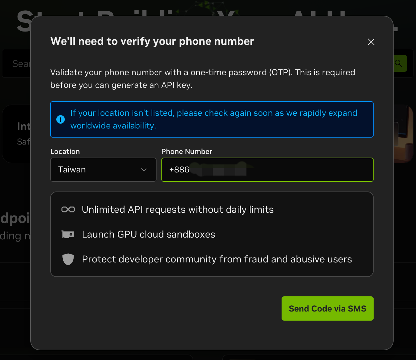 登入後頁面頂部會跳出一條橫幅:「Verify your account to unlock API access」,點進去輸入手機號收簡訊驗證碼。台灣手機直接選 +886,輸入後 9 碼即可。這一步沒做完,後面拿到的 Key 是沒辦法呼叫 API 的,這裡容易被跳過。