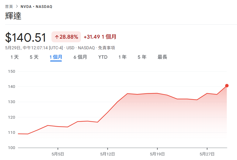輝達市值重回全球第一!據谷歌財經數據顯示,昨(29)晚美股開盤後,輝達(Nvidia)股票一度上漲 6%,衝上 140 美元,創下近 1 個月以來的新高,市值也達到 3.43 兆美元,超越了微軟和蘋果,再度成為全球市值最大的上市公司。