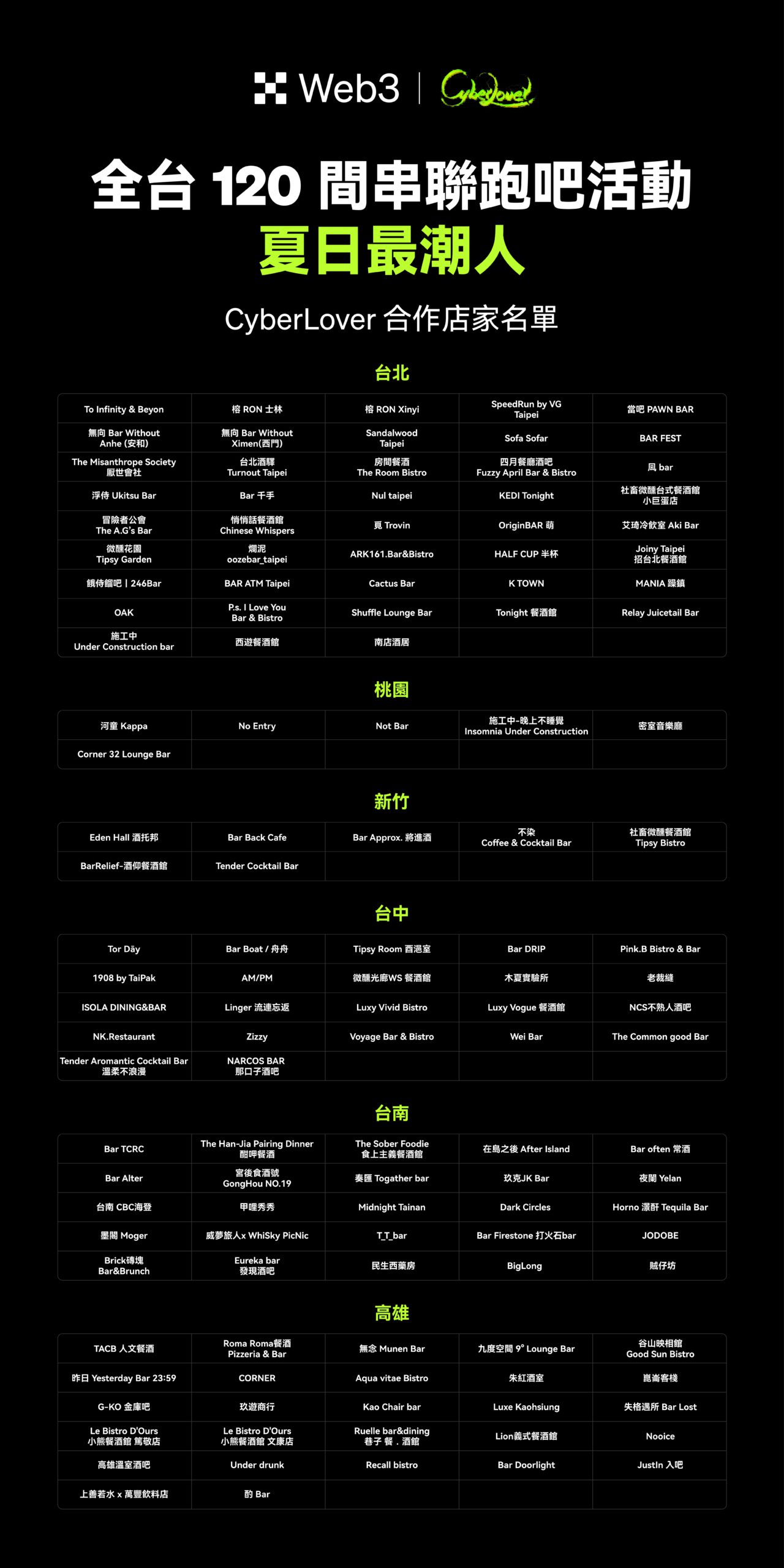 台北、桃園、新竹、台中、台南、高雄等全台 120 家酒吧名單如下: