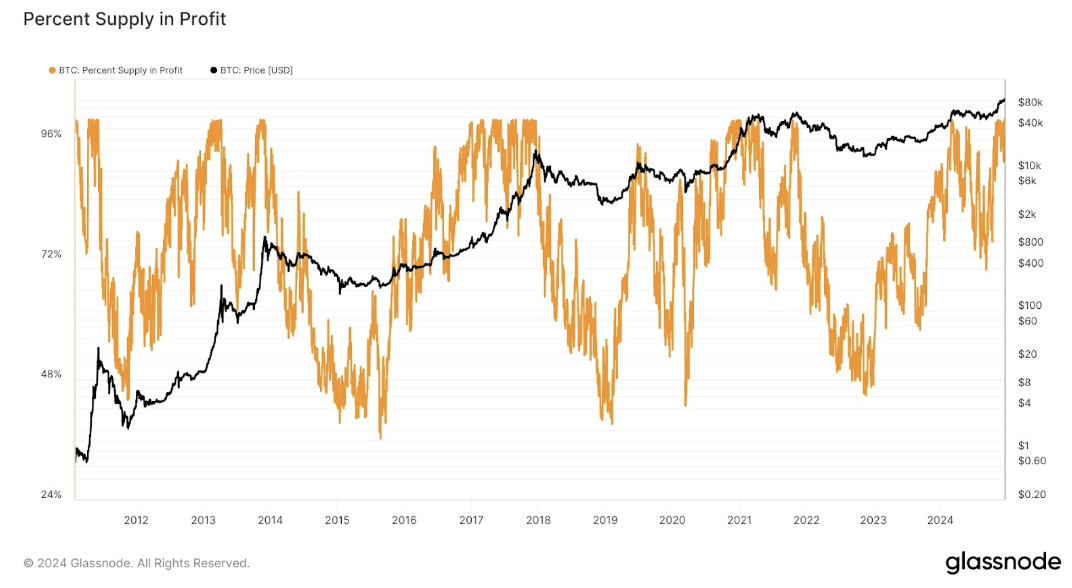 PSIP,全稱 Percent Supply In Profit,定義是「流通的 BTC 中,處於盈利狀態的籌碼佔比」。計算上,是透過「比較現價與每個 BTC 的上次轉移價」,來區分盈利、虧損的籌碼。