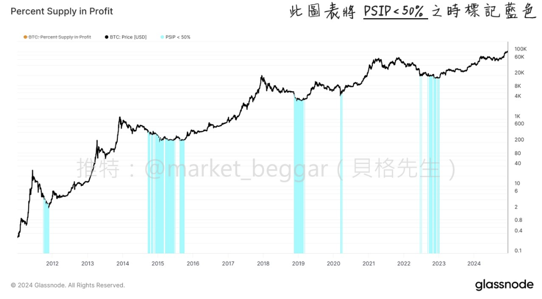 - PSIP = 流通的 BTC 中,處於盈利狀態的籌碼佔比