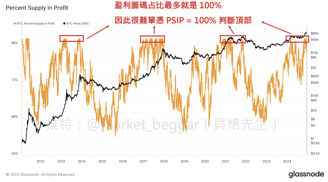如下圖所示,由於盈利籌碼的佔比最高就是 100%,因此很難單憑 PSIP 來判斷頂部。