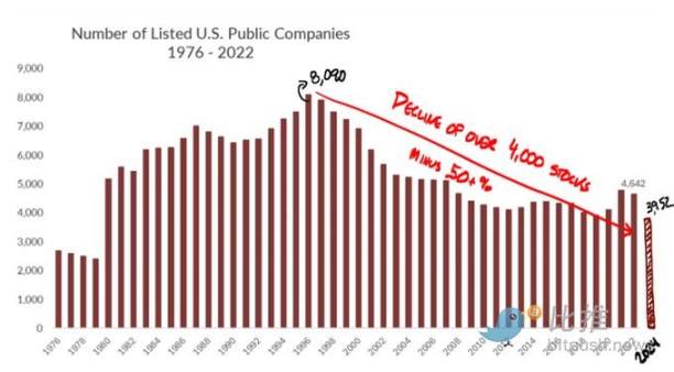 因為顯然,網際網路公司應該以網際網路原生的形式存在於鏈上,並能夠通過加密訪問網際網路規模的資本市場。事實上,儘管紐約上市的股票數量一直在下降,但網際網路上市的數位資產數量一直在上升。