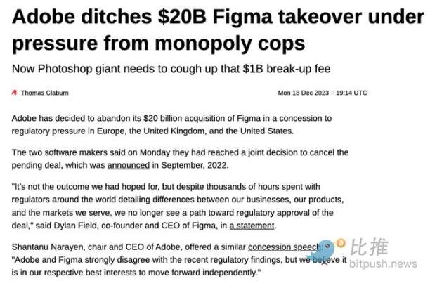 然而,自從 Lina Khan 領導下的聯邦貿易委員會(FTC)上臺以來,大型併購被以「增加競爭」為由阻止,理由是禁止大魚吃小魚。這就是歐盟、美國和英國聯合監管機構對 Adobe 收購 Figma 的打擊背後的(表面)理由,而這一收購本應是一次鉅額退出,為更多初創企業提供資金: