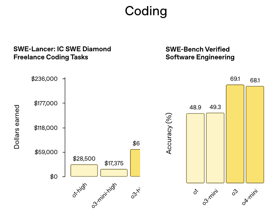 o3 被定位為 OpenAI 目前最強的推理模型,專為複雜的數學、科學、程式碼撰寫與圖像邏輯任務設計,在 SWE-bench Verified(軟體工程基準測試)中實現了最先進的效能,得分為 69.1%,領先 Claude 3.7 Sonnet 的 62.3%。
