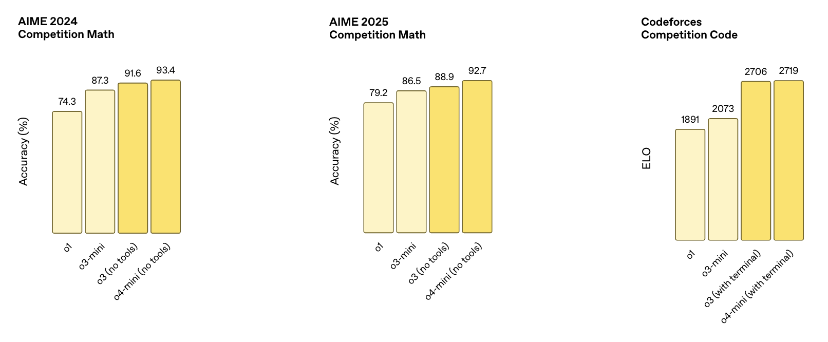 o4-mini 則在保留高推理力的同時,兼顧成本與速度,成為開發者的輕量首選。根據 OpenAI 的測試數據,o4-mini 在 AIME(美國數學競賽)2024 和 2025 的表現分別為 93.4% 和 92.7%,超越了完整版 o3,成為當前準確率最高的模型;在 Codeforces 比賽中獲得 2700 分,躋身全球前 200 名頂尖工程師。