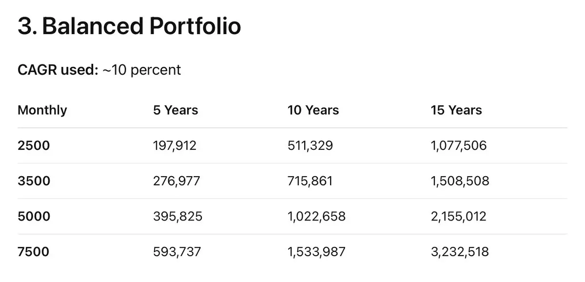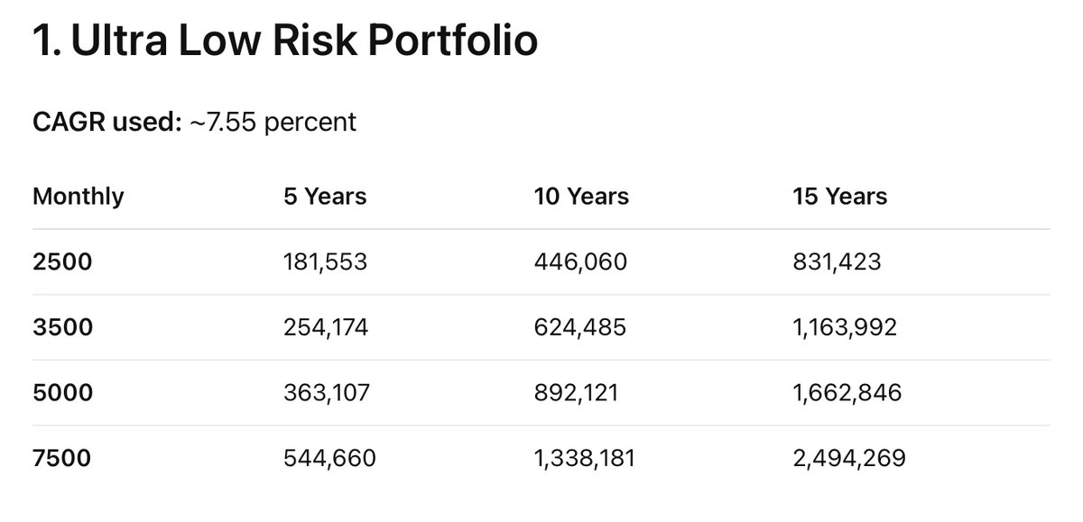 以下是五種投資組合,附有其波動性和複合年成長率(CAGR)的預期,以及 5 年、10 年和 15 年後的預期回報。