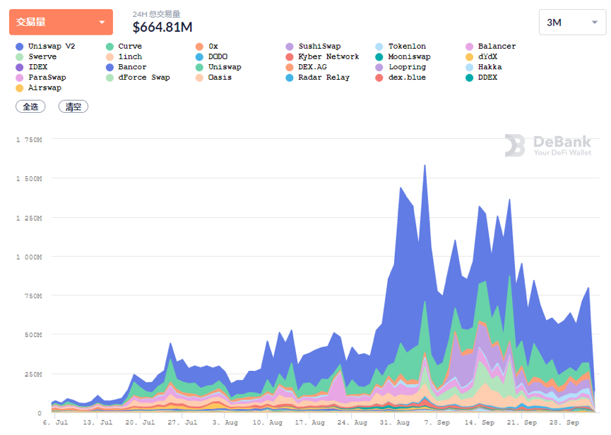 SushiSwap、Moonswap、MiniSwap、Sakeswap…… 各種各樣的 Swap 項目來得快,去得也快,最終還是 Uniswap 獨占鰲頭。與前一個月相比,去中心化交易所的成交量上升。