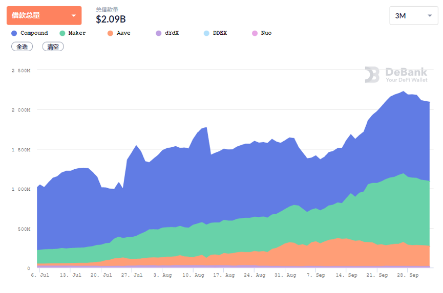 以太坊上去中心化借貸市場的總借款量達到 22 億美元,相比一個月前上升 36%。牢牢佔據第一的仍然是 Compound,佔了總借款量的接近一半。