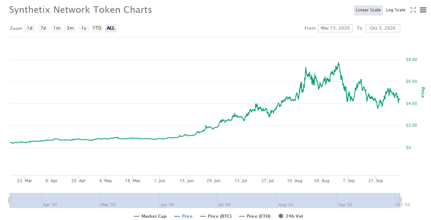 因為流動性挖礦的沒落,作為重要「鏟子」的 SNX 價格也在 9 月份下跌了 36%。由於 Synthetix 中只能以平台幣 SNX 作為抵押物,合成資產的規模必然也會受到影響。